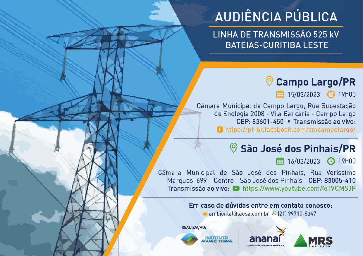 A ANANAÍ TRANSMISSORA DE ENERGIA ELÉTRICA S.A., concessionária do Lote 01 do Leilão de Transmissão de Energia Elétrica nº 02/2021 da Agência Nacional de Energia Elétrica – ANEEL, convida a todos a participarem das Audiências Públicas referentes à obtenção de Licença Prévia da Linha de Transmissão 525 kV Bateias – Curitiba Leste, em Processo de Licenciamento Ambiental no Estado do Paraná junto ao Instituto Água e Terra (IAT).